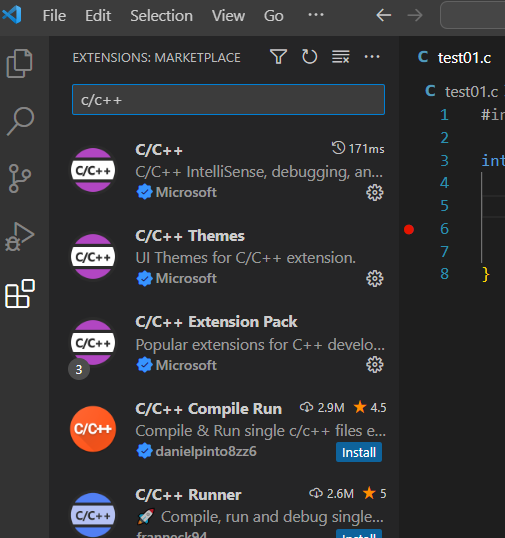 在visual studio code中扩展市场的搜索框中输入”C/C++“下载相关插件,下图中的前三个